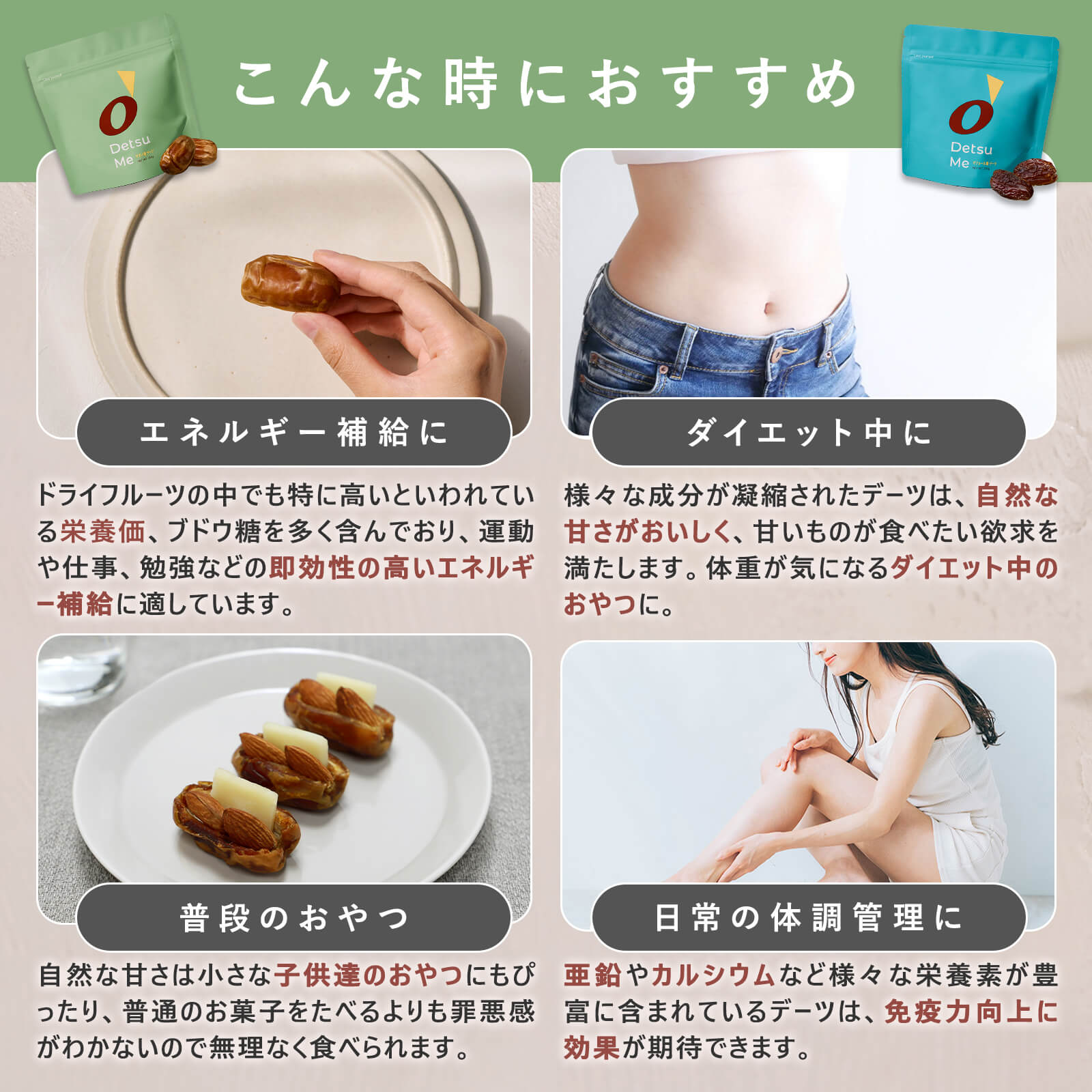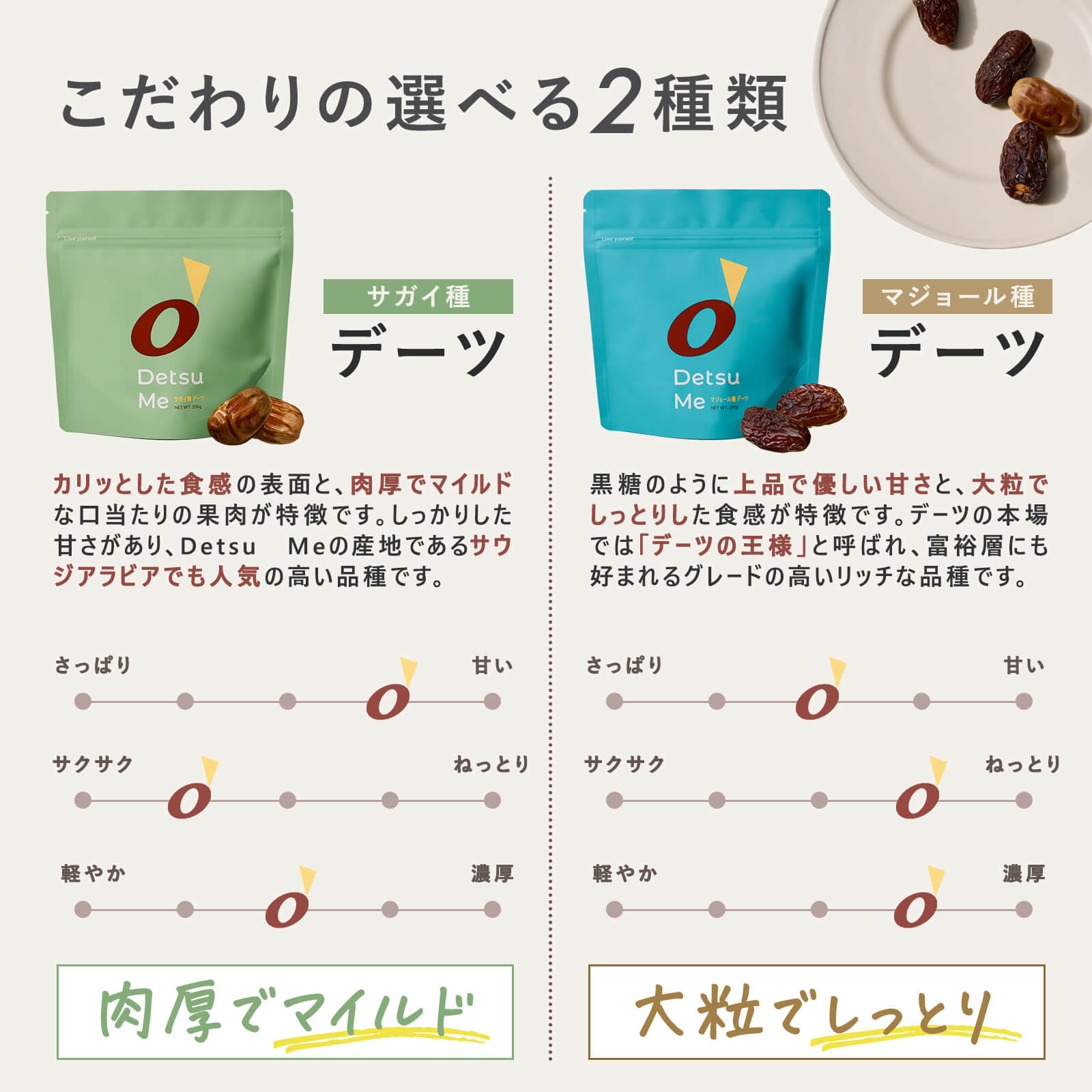 通常、乾燥させて販売されることが多いデーツですが、Detsu Meのデーツは、特別なおいしさをお届けしたいという思いでセミドライにこだわりました。そのため、より新鮮でデーツ本来の味わいを豊かに感じることができます。一口食べればきっと納得してもらえるはずです。